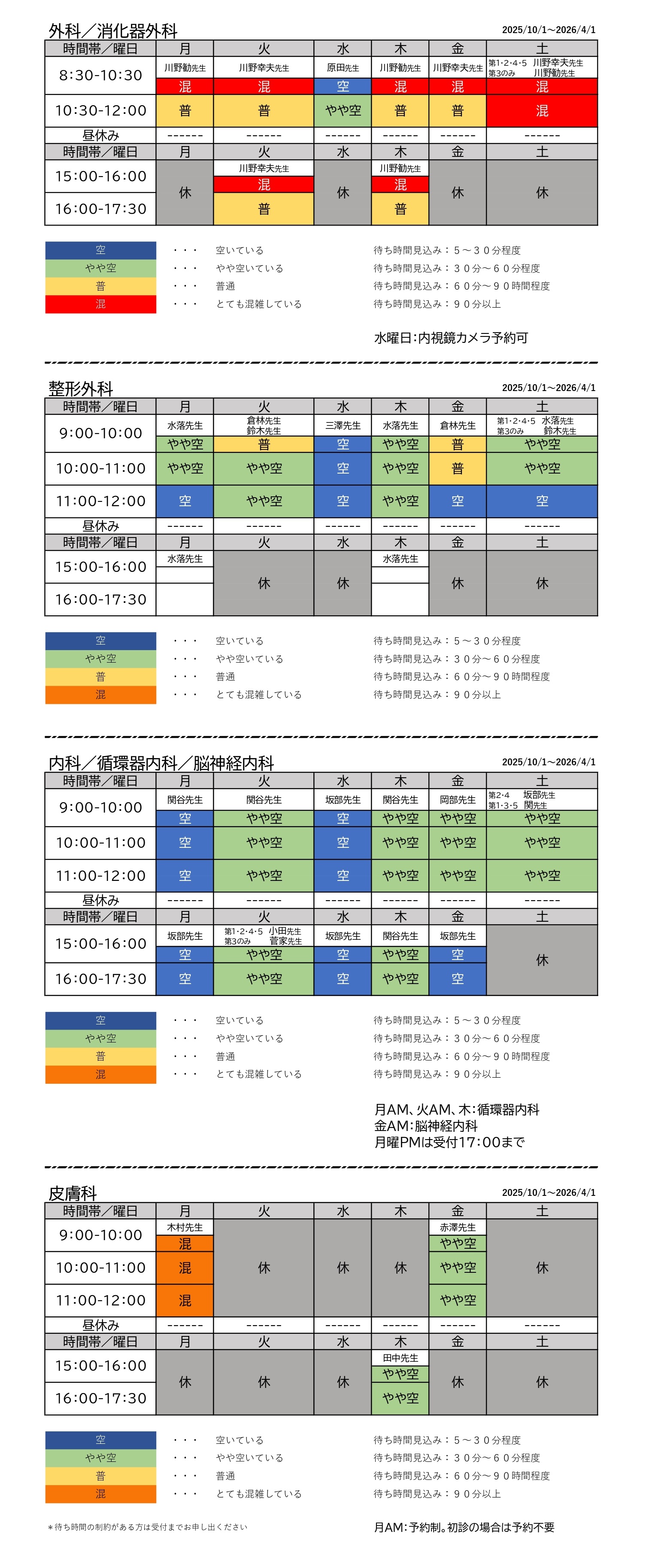 当院の平均的な混雑具合は下記のようになっております。 このデータは統計的なデータであり、リアルタイムの状況を示しているものではありません。 あくまでも目安となるもので、連休前後などの状況により変わります。